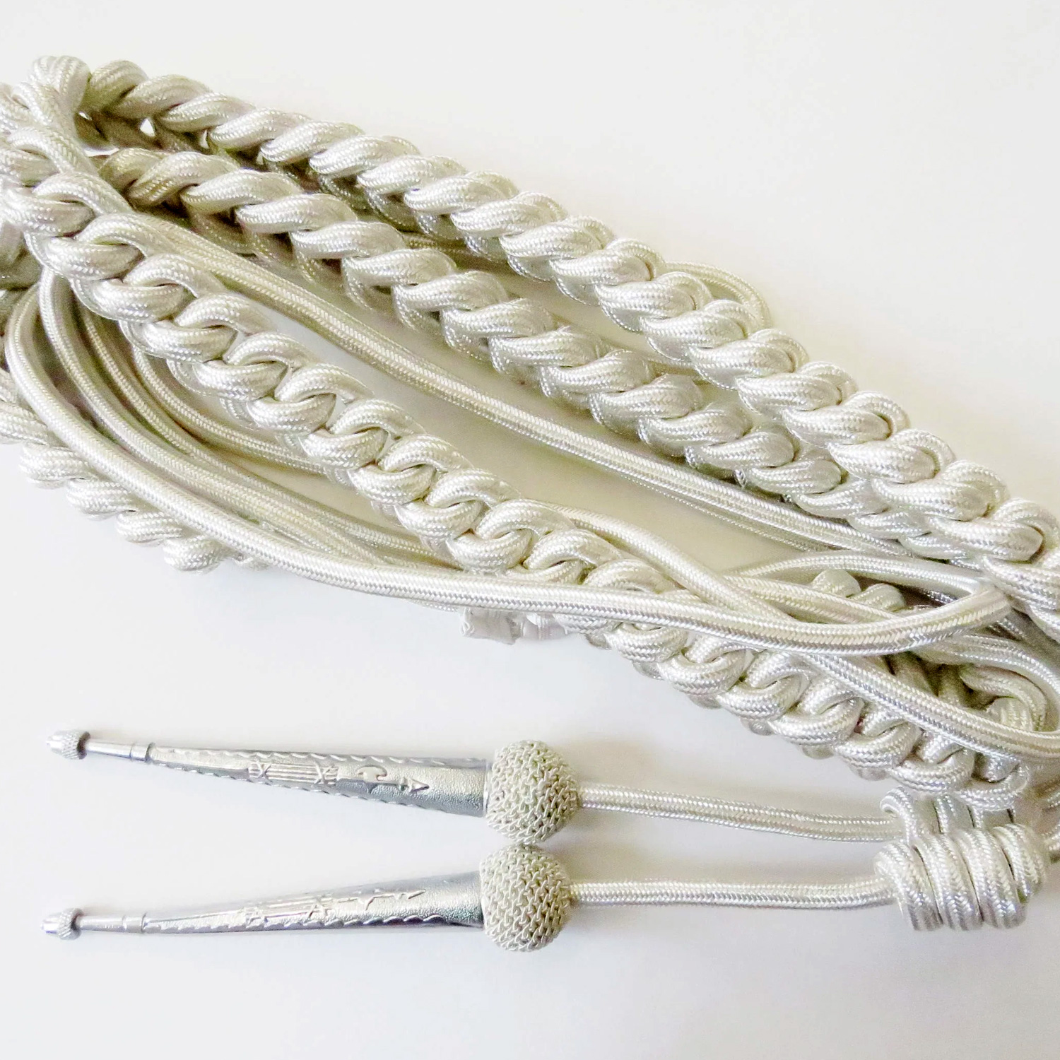 Silver coloured Aiguillette with silver tags and netted tops. Worn on the right shoulder.